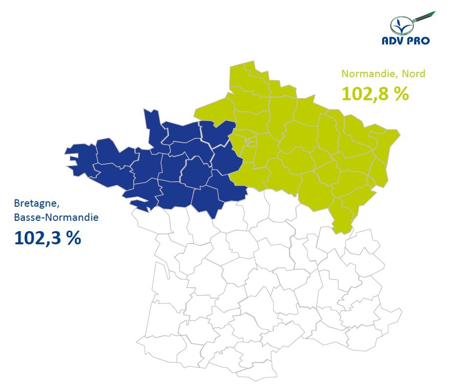 Synthèse 8 essais régionaux, Rendement fourrage exprimé en % de la moyenne des témoins 2020, réseau France Advanta ADV PRO